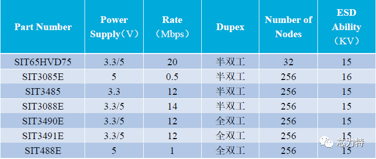 芯力特成為擁有全雙工、半雙工、5V供電、3.3V供電,滿足高速、中速、低速通訊應(yīng)用的全品類、高品質(zhì)RS485廠商。各品類典型型號(hào)如下。